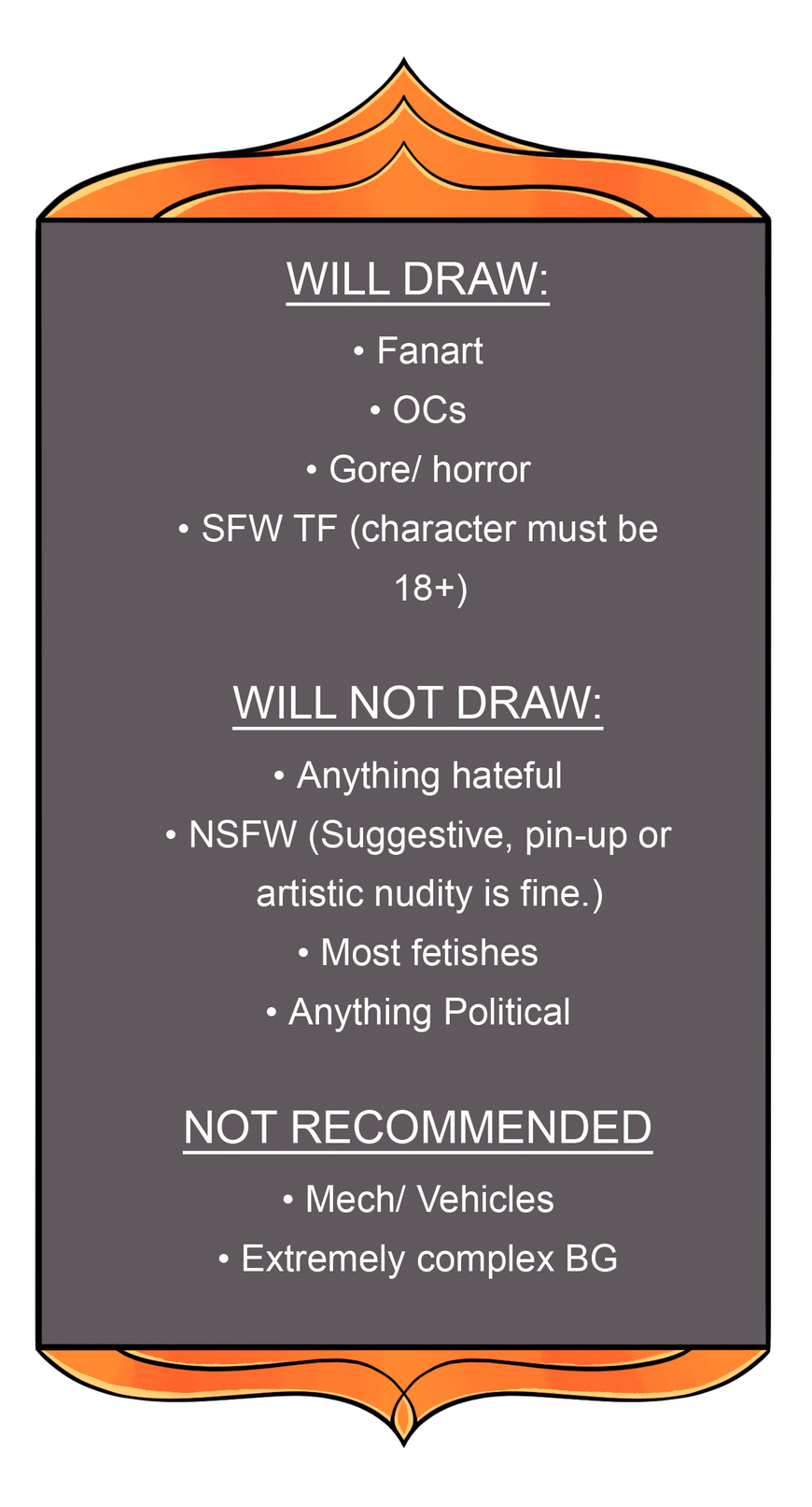 -I retain the copyright over the commissioned work and am allowed post it online or use it in my portfolio. If you don't want your commission shared and or wish to stay anonymous please let me know.NSFW and Fetish Rules: